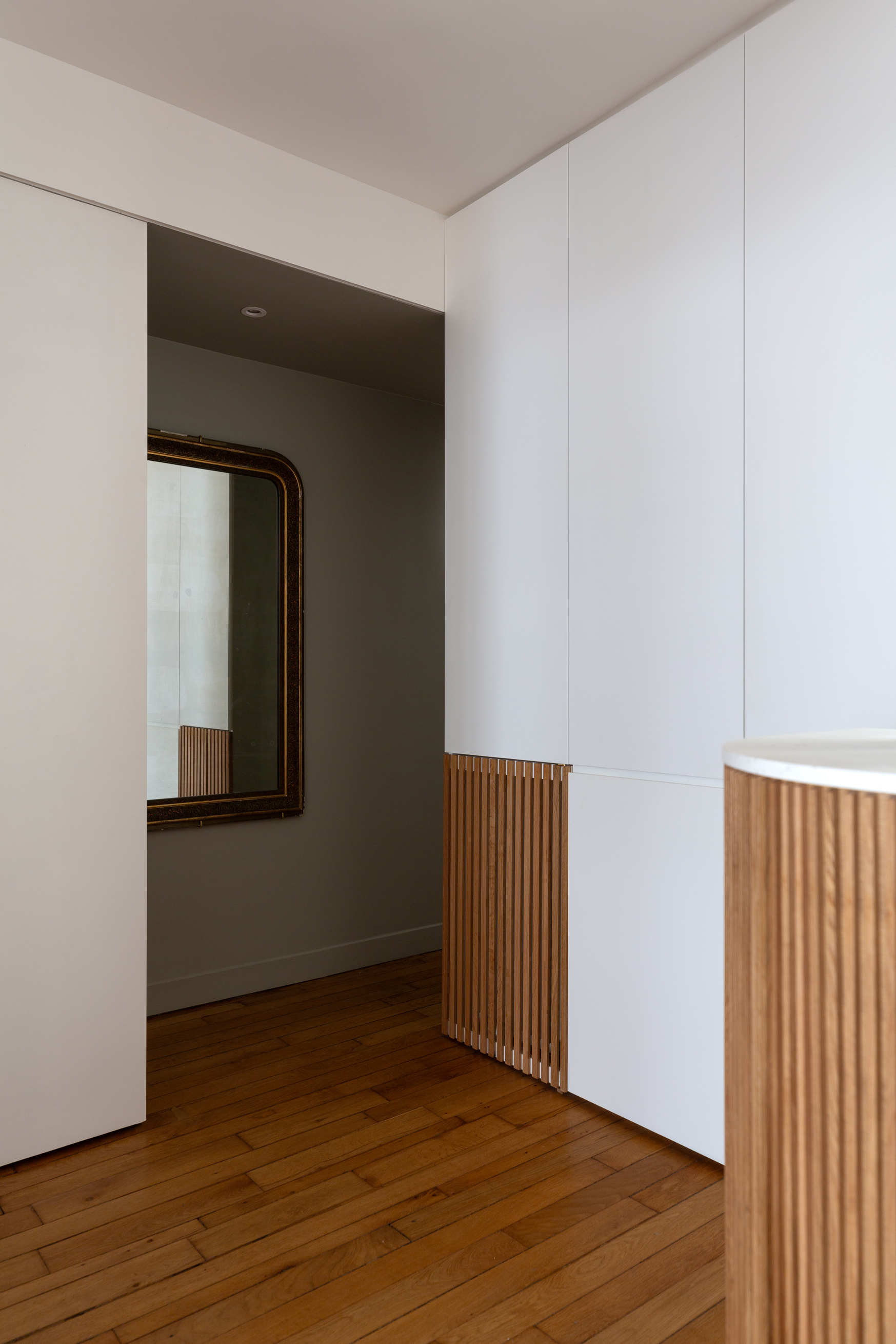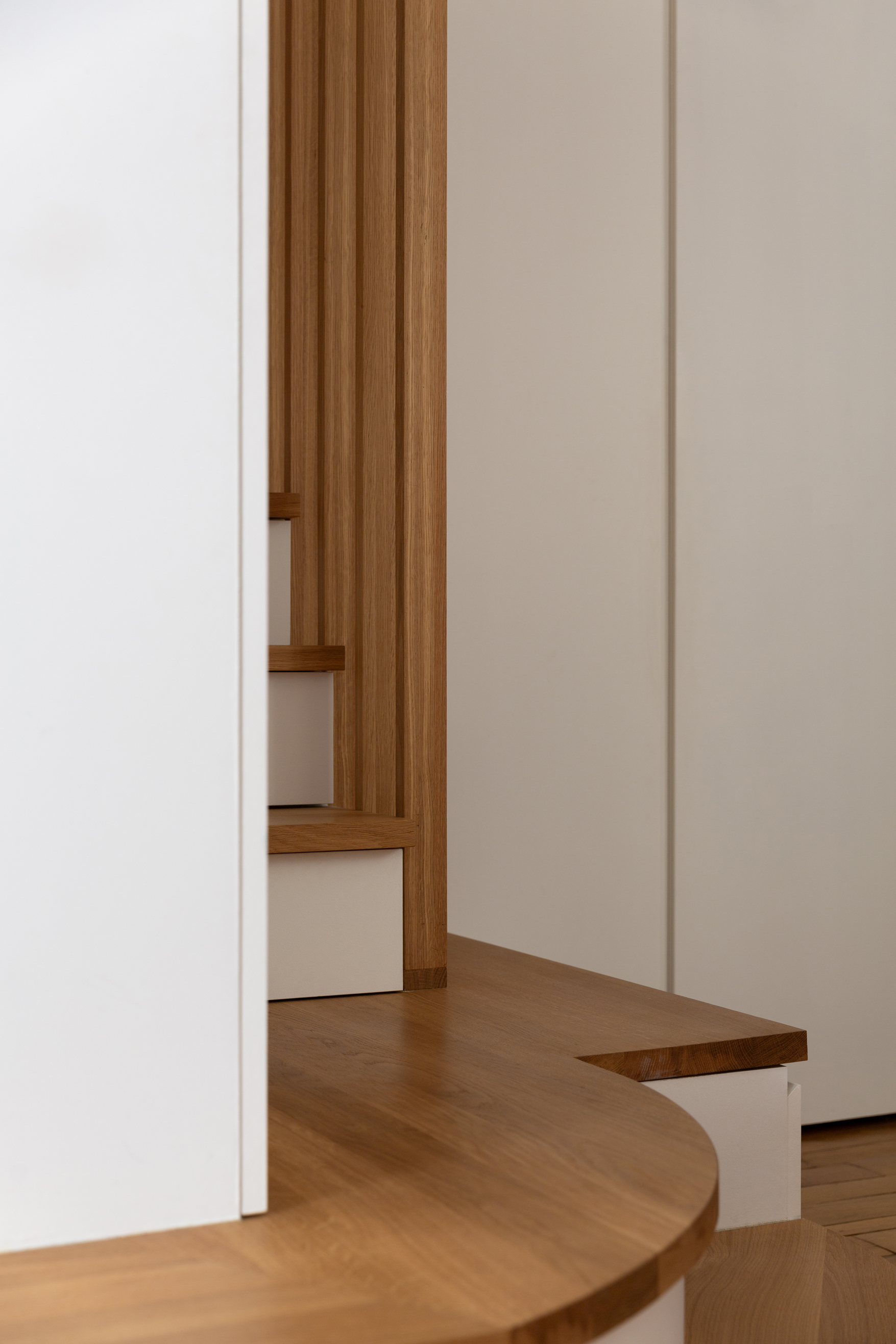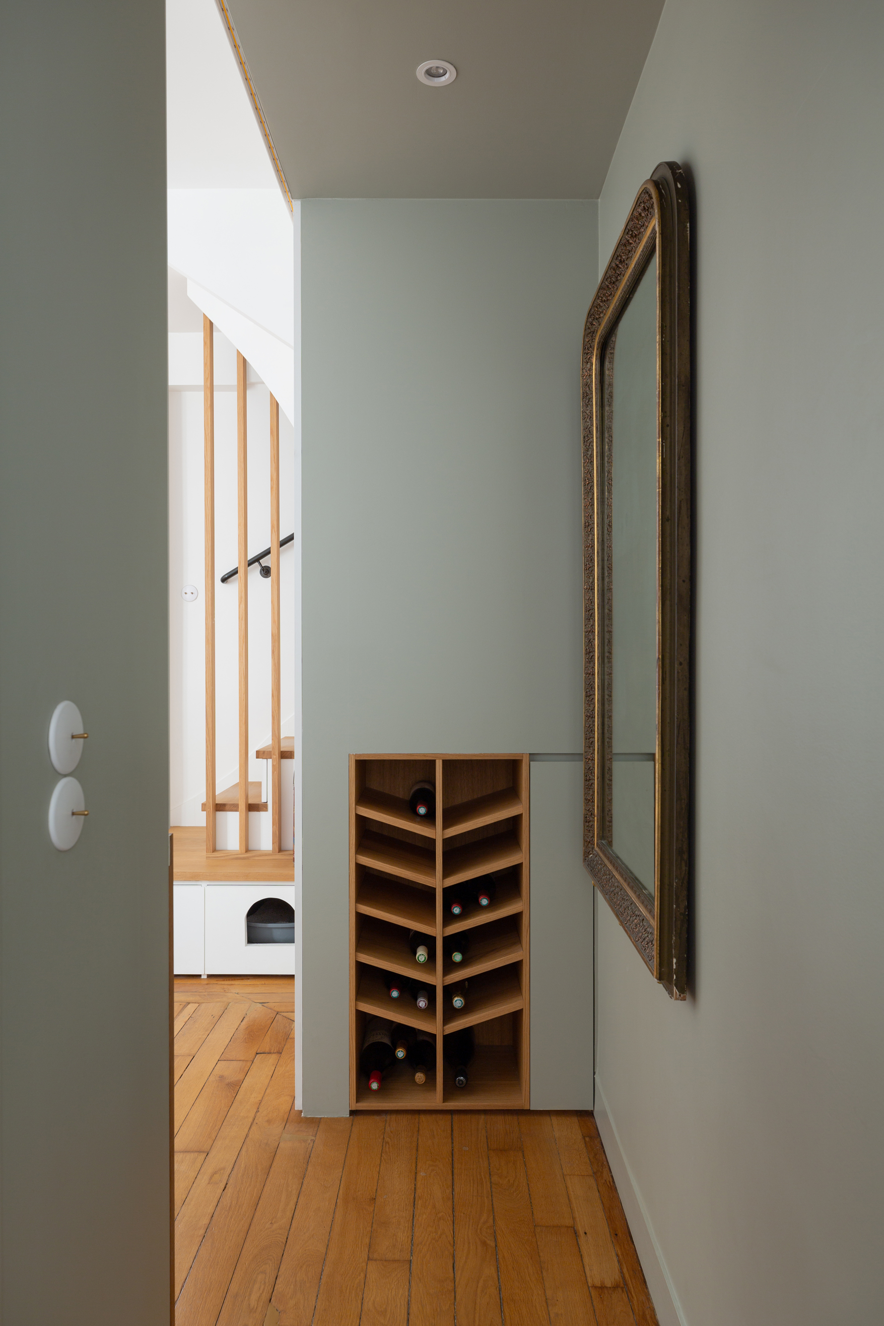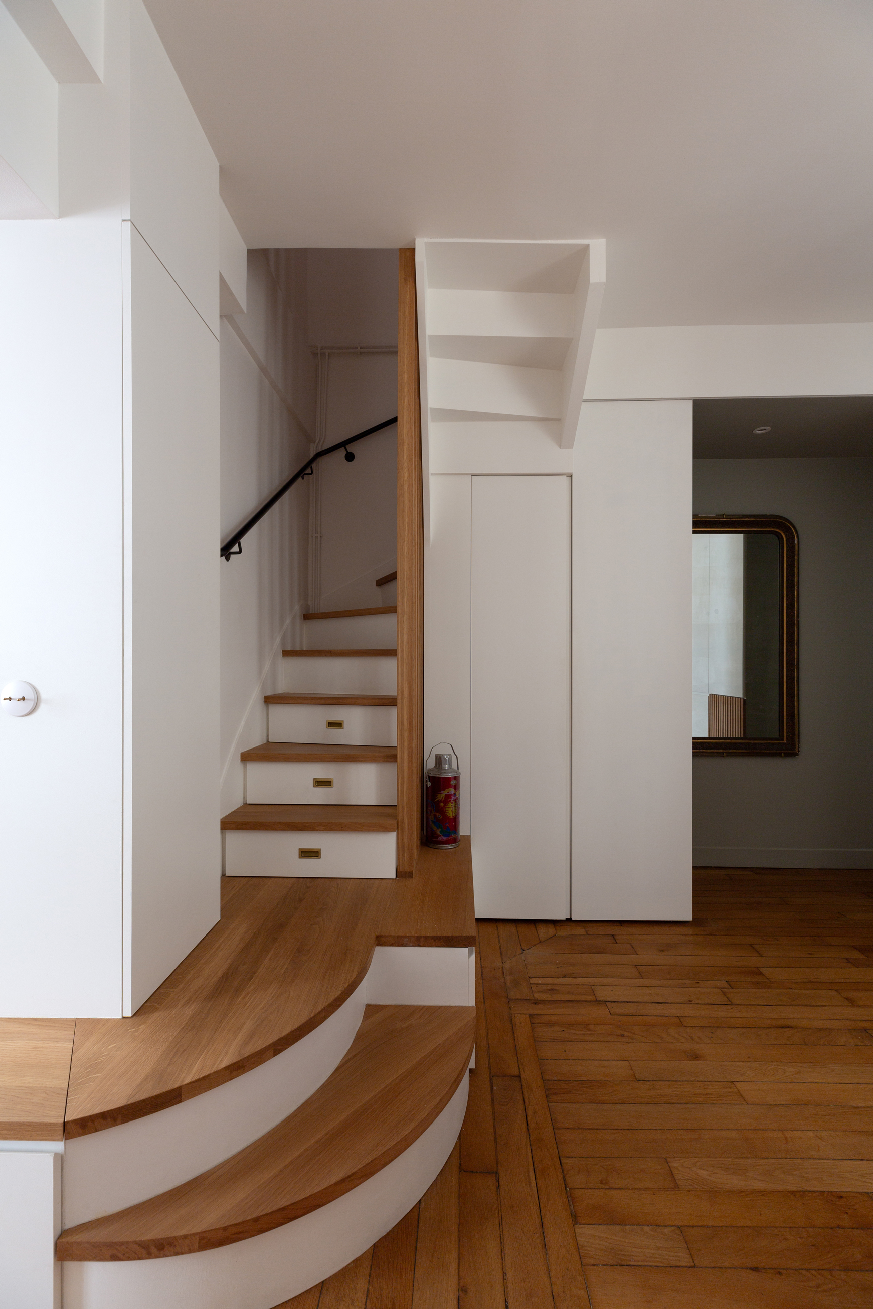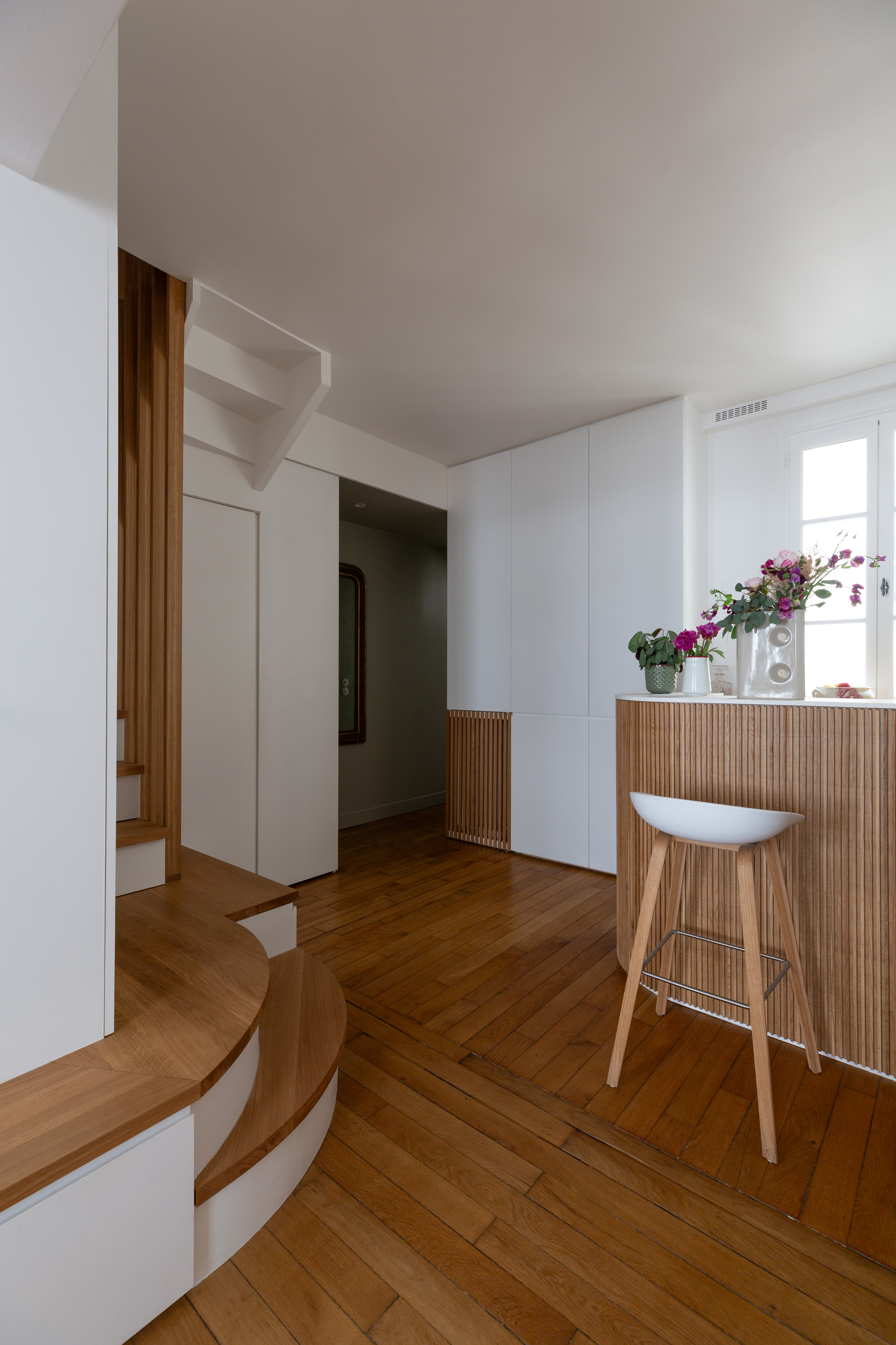 La restructuration du noyau central de cet appartement a permis de transformer un espace autrefois perçu comme un simple couloir en un véritable lieu de vie, au croisement de l’entrée, de la cuisine, de la salle à manger et de l’accès à l’étage. Nous avons imaginé un ensemble menuisé unique qui réunit escalier-rangement, estrade, banquette pour le nouveau bar, meuble TV, vaisselier et vestibule, afin de répondre de manière fluide aux usages quotidiens de la famille. Chaque détail a été pensé pour intégrer de nouvelles fonctions — rangements optimisés, accueil discret de la litière du chat, organisation de la vaisselle , des manteaux, chaussures — faisant de cet espace le centre fonctionnel et chaleureux de l’appartement.