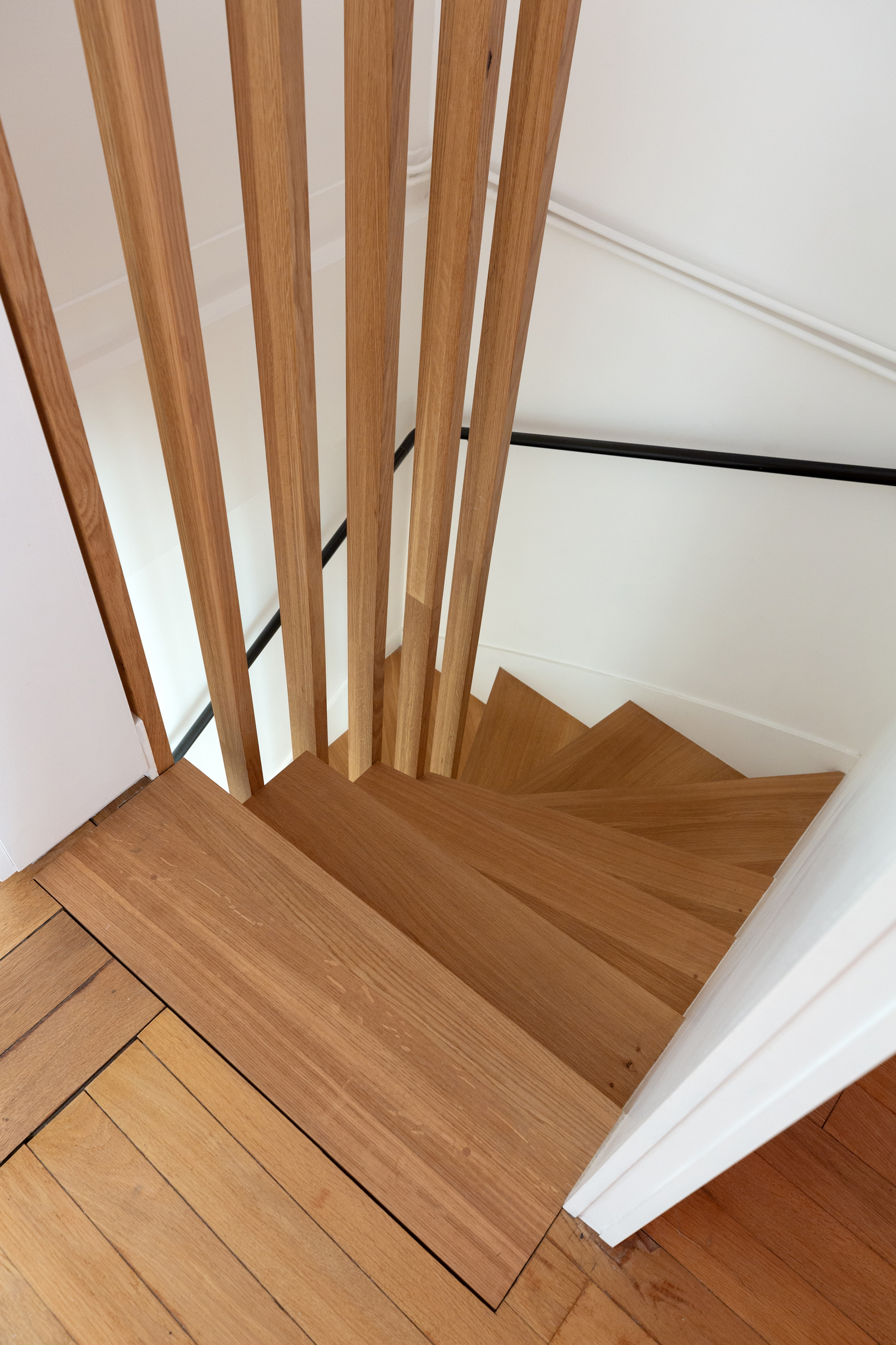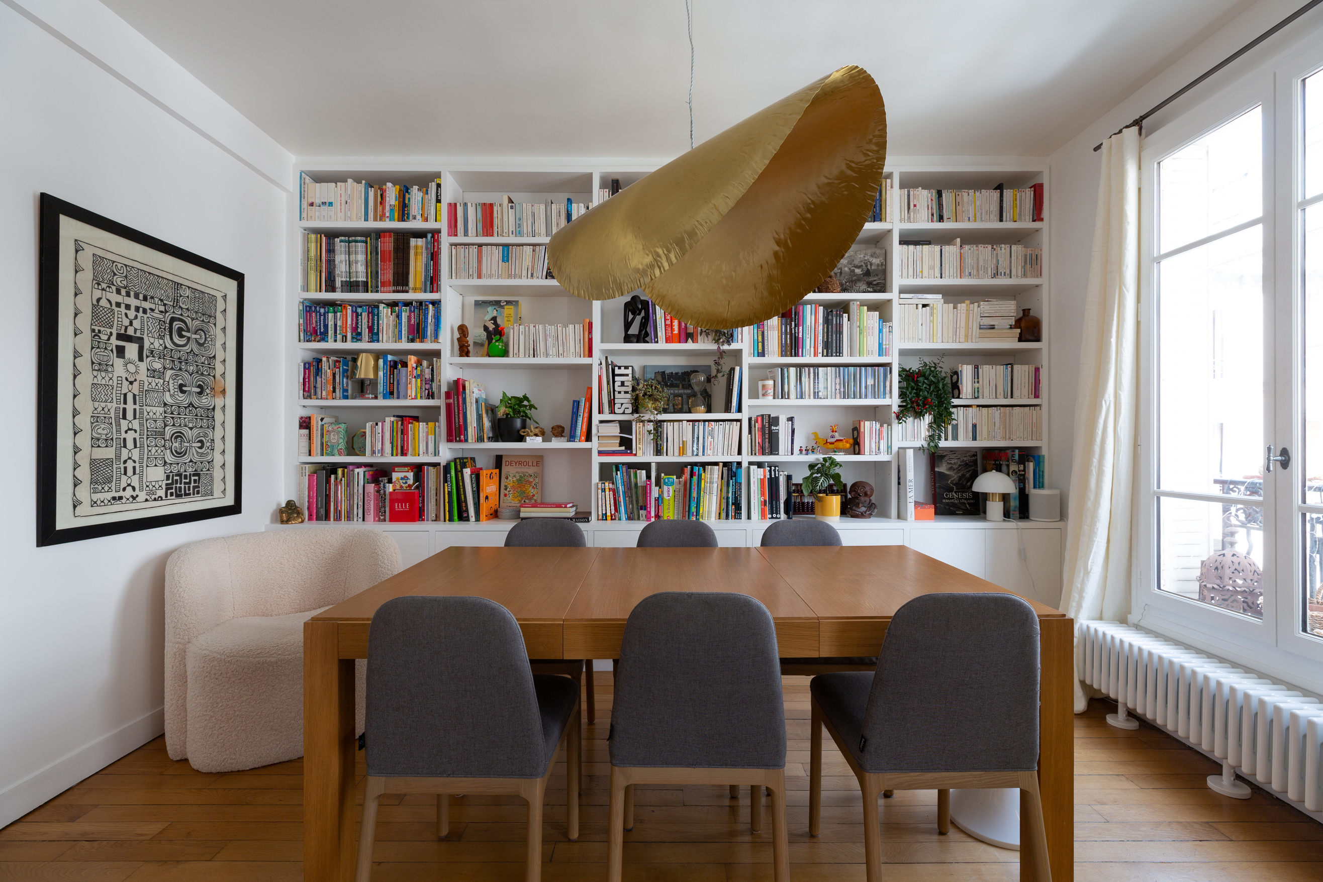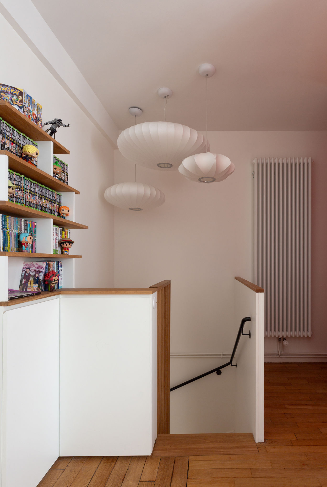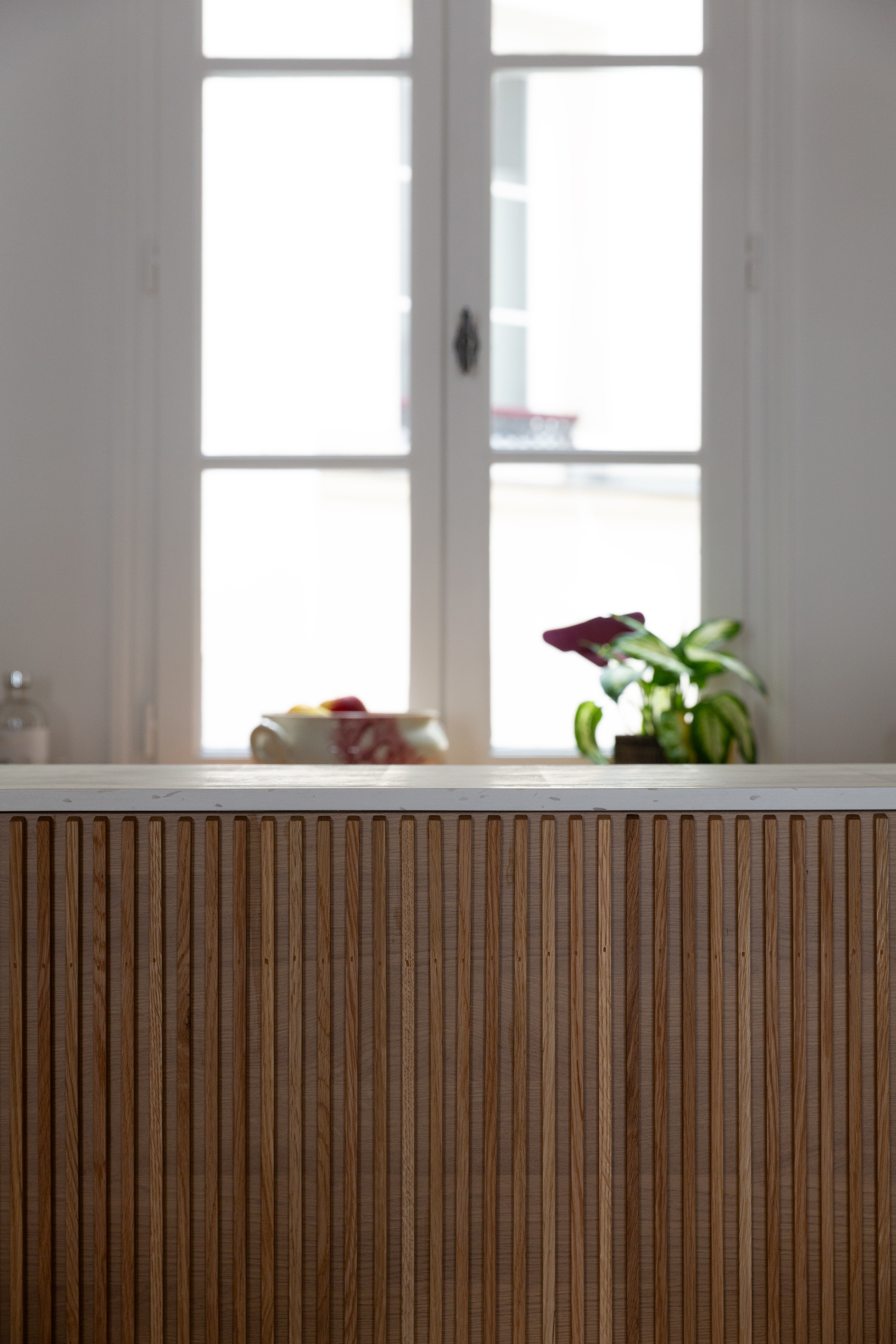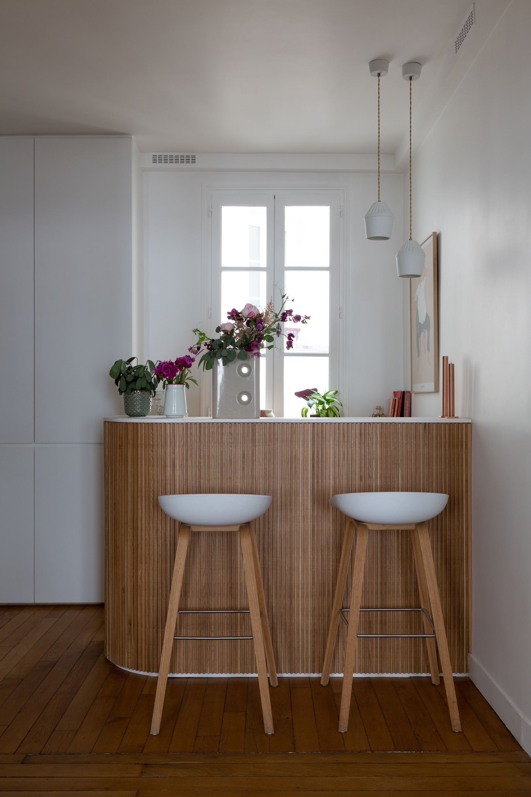 La restructuration du noyau central de cet appartement a permis de transformer un espace autrefois perçu comme un simple couloir en un véritable lieu de vie, au croisement de l’entrée, de la cuisine, de la salle à manger et de l’accès à l’étage. Nous avons imaginé un ensemble menuisé unique qui réunit escalier-rangement, estrade, banquette pour le nouveau bar, meuble TV, vaisselier et vestibule, afin de répondre de manière fluide aux usages quotidiens de la famille. Chaque détail a été pensé pour intégrer de nouvelles fonctions — rangements optimisés, accueil discret de la litière du chat, organisation de la vaisselle , des manteaux, chaussures — faisant de cet espace le centre fonctionnel et chaleureux de l’appartement.