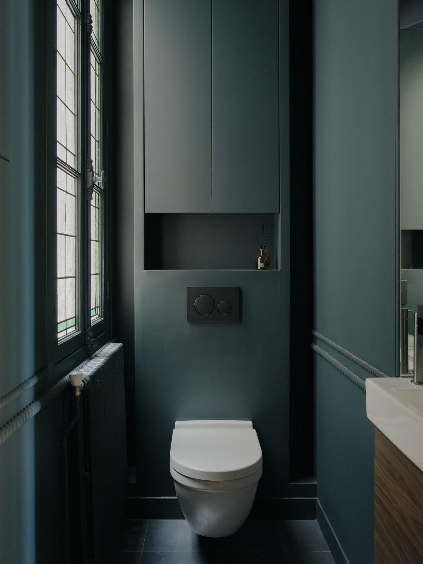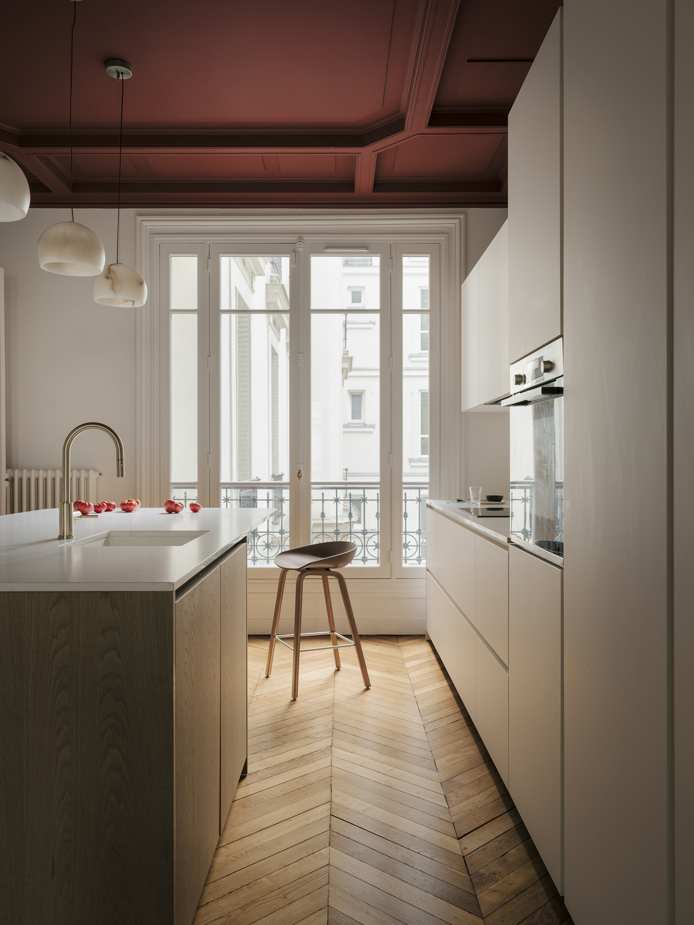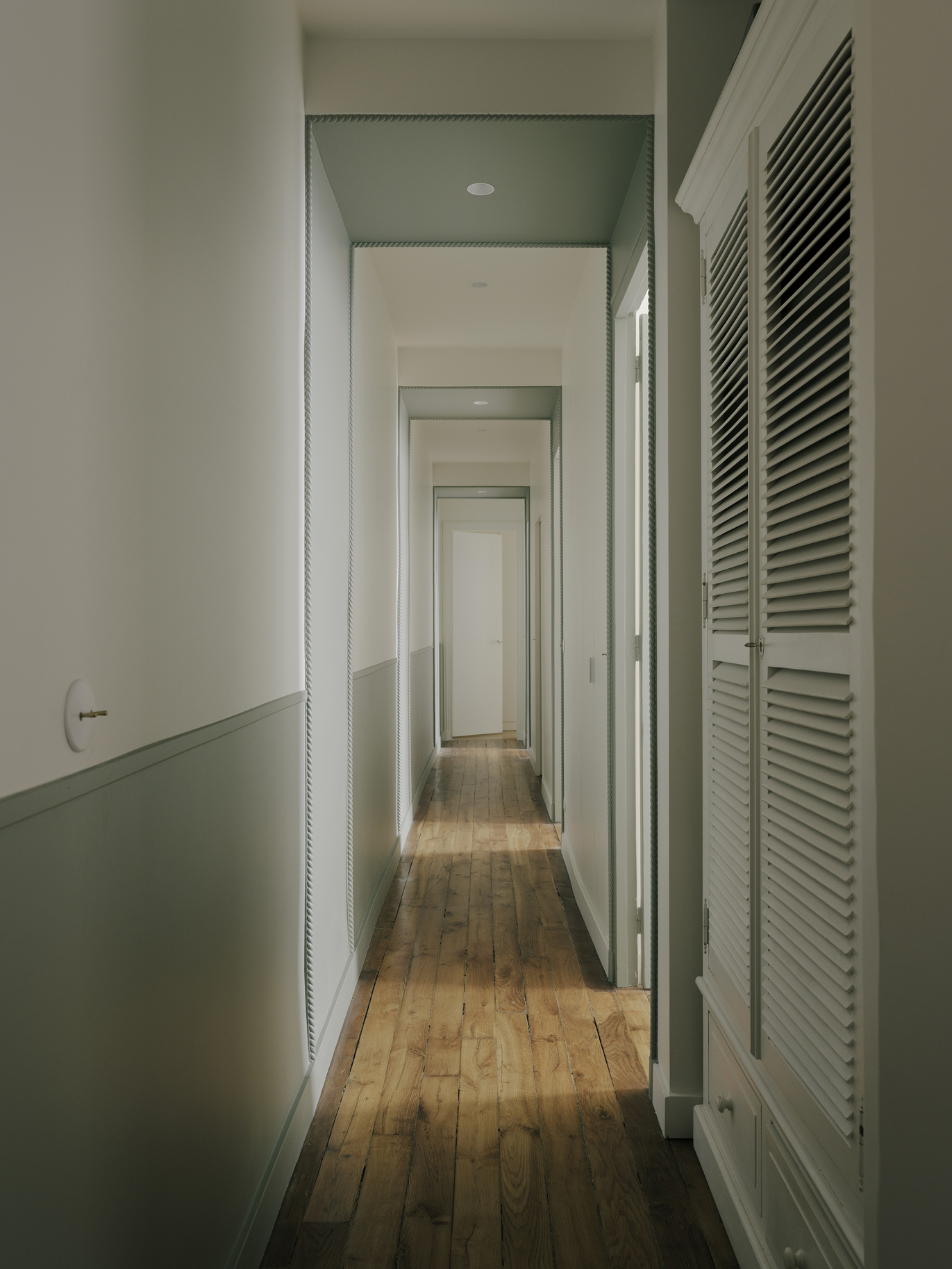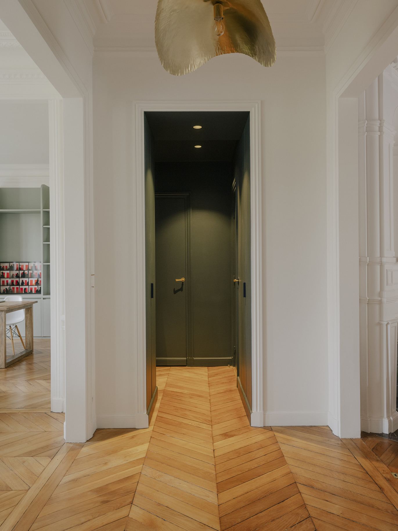 Le projet s’articule autour d’un décloisonnement des espaces et d’un déplacement des fonctions afin de révéler la générosité du lieu. Malgré la présence de couloirs contraints par la structure existante du bien, chaque recoin a été optimisé pour retrouver fluidité et cohérence. Le patrimoine ancien a été mis en valeur grâce à un travail attentif sur la lumière, la couleur et le confort acoustique et thermique, les teintes choisies permettant de donner de la profondeur et d’accentuer les volumes. En étroite collaboration avec les clients, un mobilier sur mesure a été conçu pour répondre aux besoins de chacun et offrir un cadre de vie à la fois fonctionnel, harmonieux et singulier.