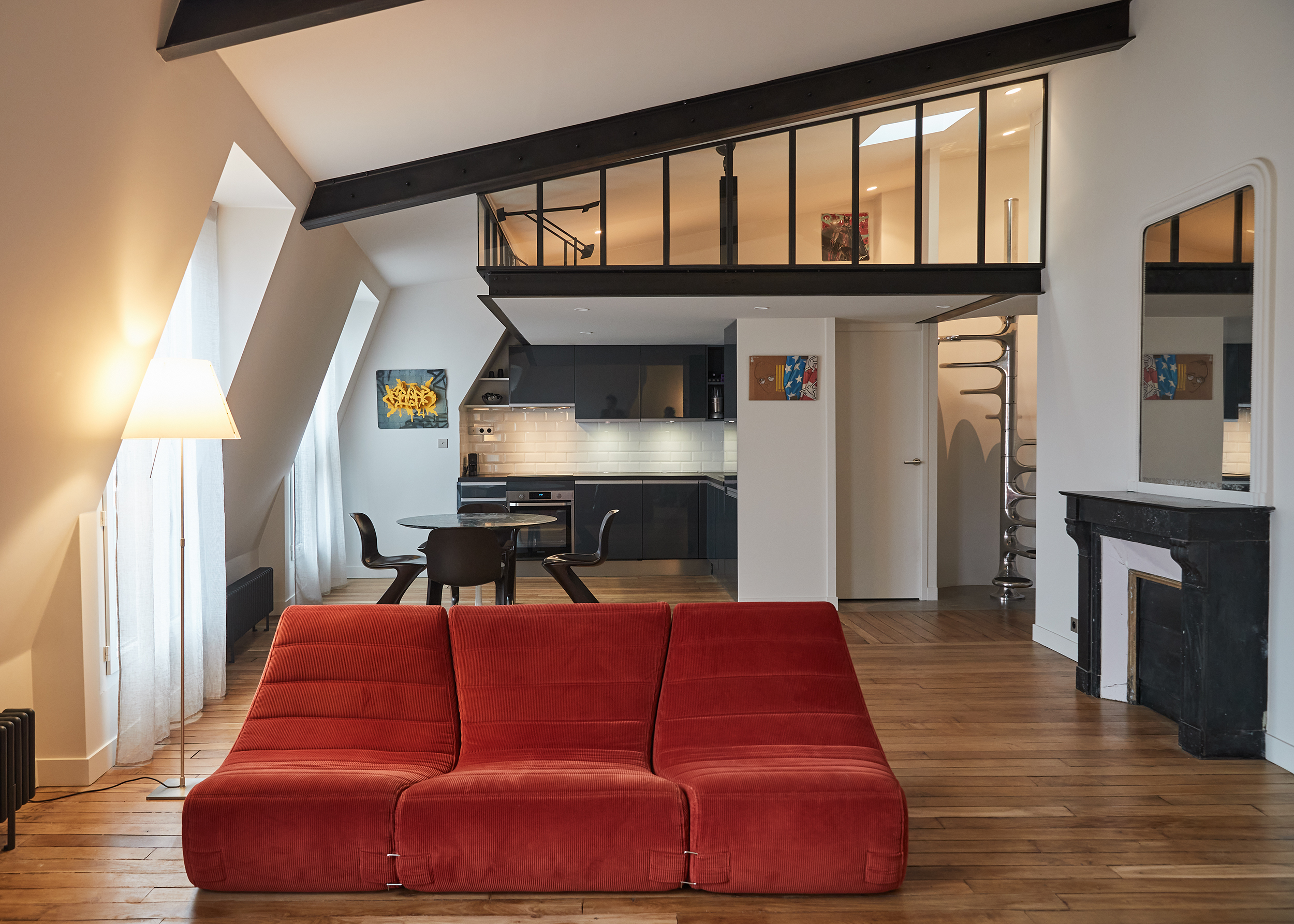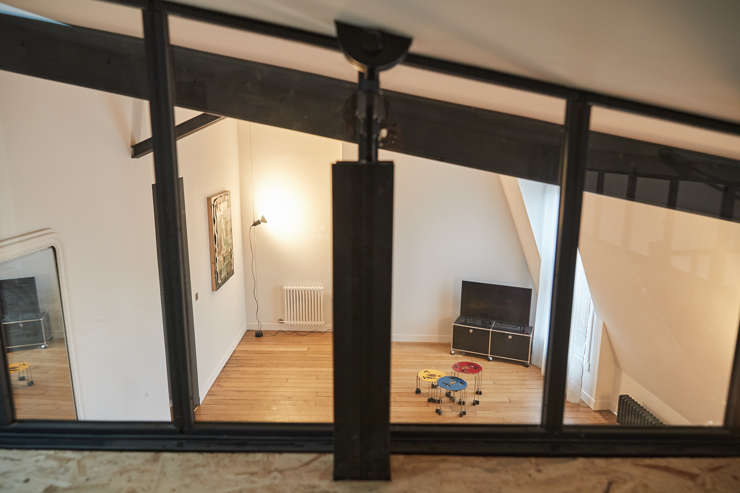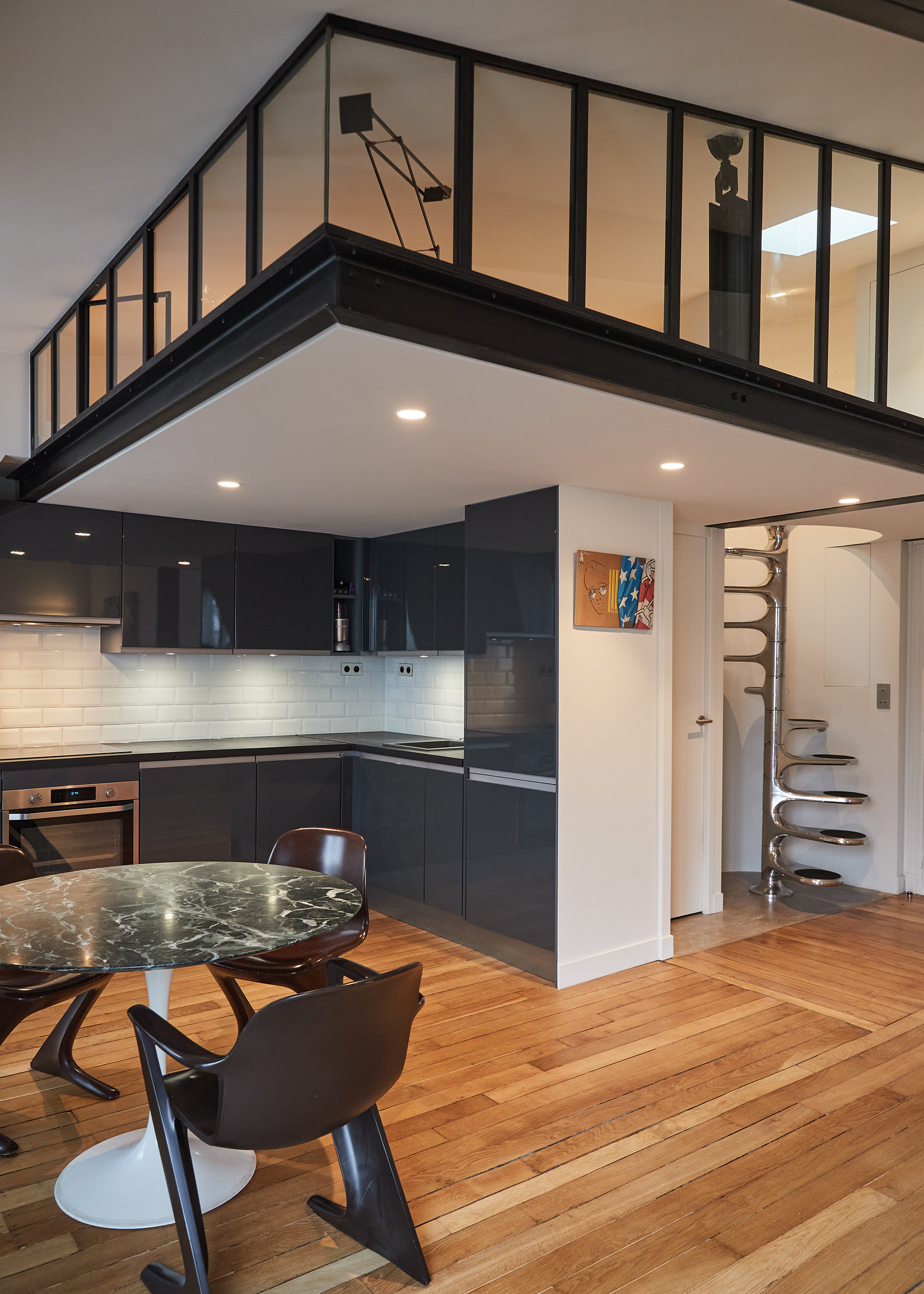Amateur de design et d’objets chinés, le client a pu acquérir les combles auprès de la copropriété pour agrandir son appartement, auparavant bas de plafond et peu généreux, déjà issu de réunion entre différentes chambres de bonnes. Nous avons partiellement restructuré les lieux pour révéler tout le potentiel des volumes et créer une mezzanine, pensée comme une boîte suspendue et vitrée, apportant légèreté et transparence. Un escalier Roger Tallon, chiné pour l’occasion, a guidé la conception des hauteurs, tandis que l’emploi de matériaux bruts et le savoir-faire du serrurier confèrent à l’ensemble un caractère à la fois industriel et raffiné.