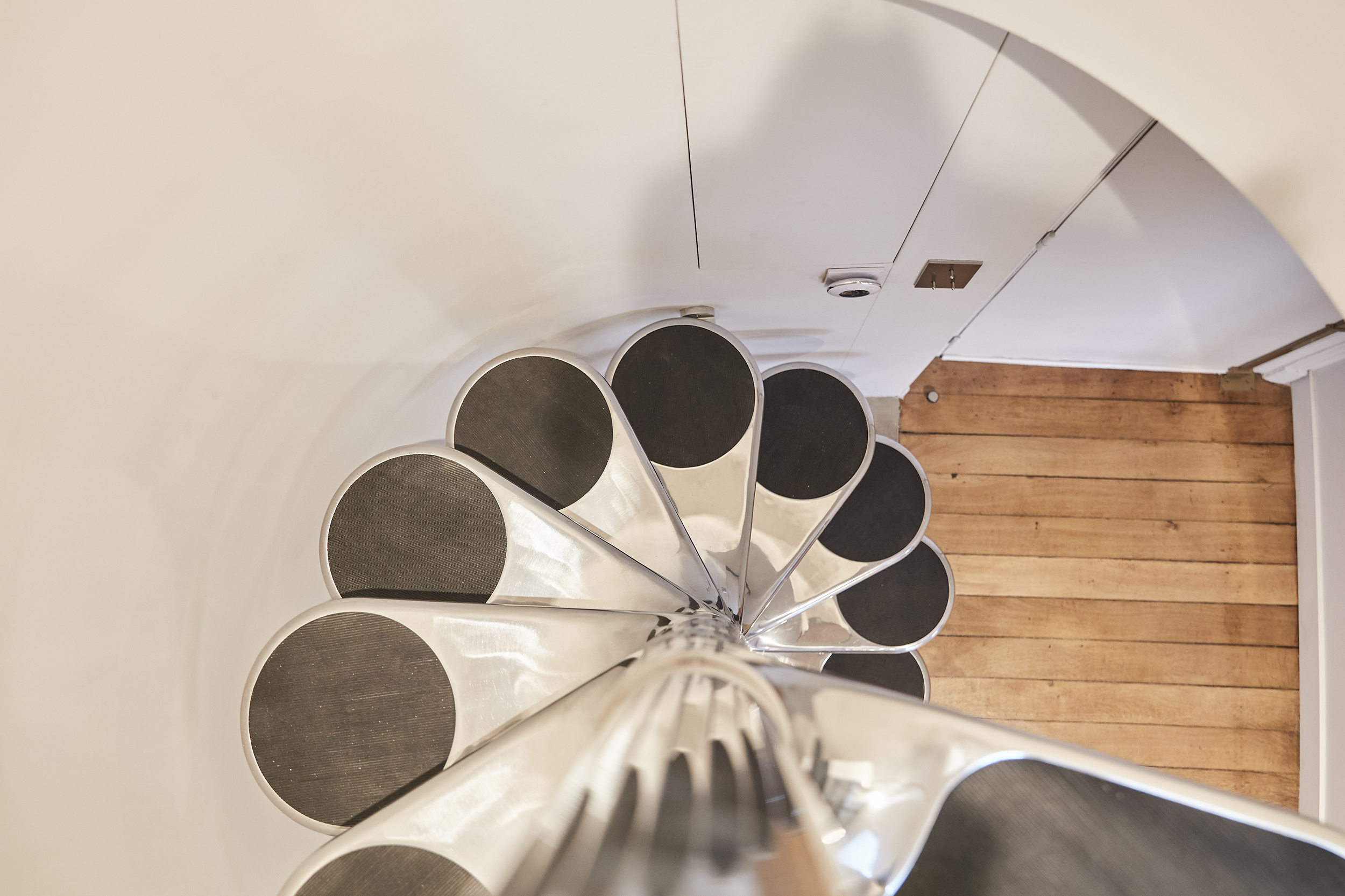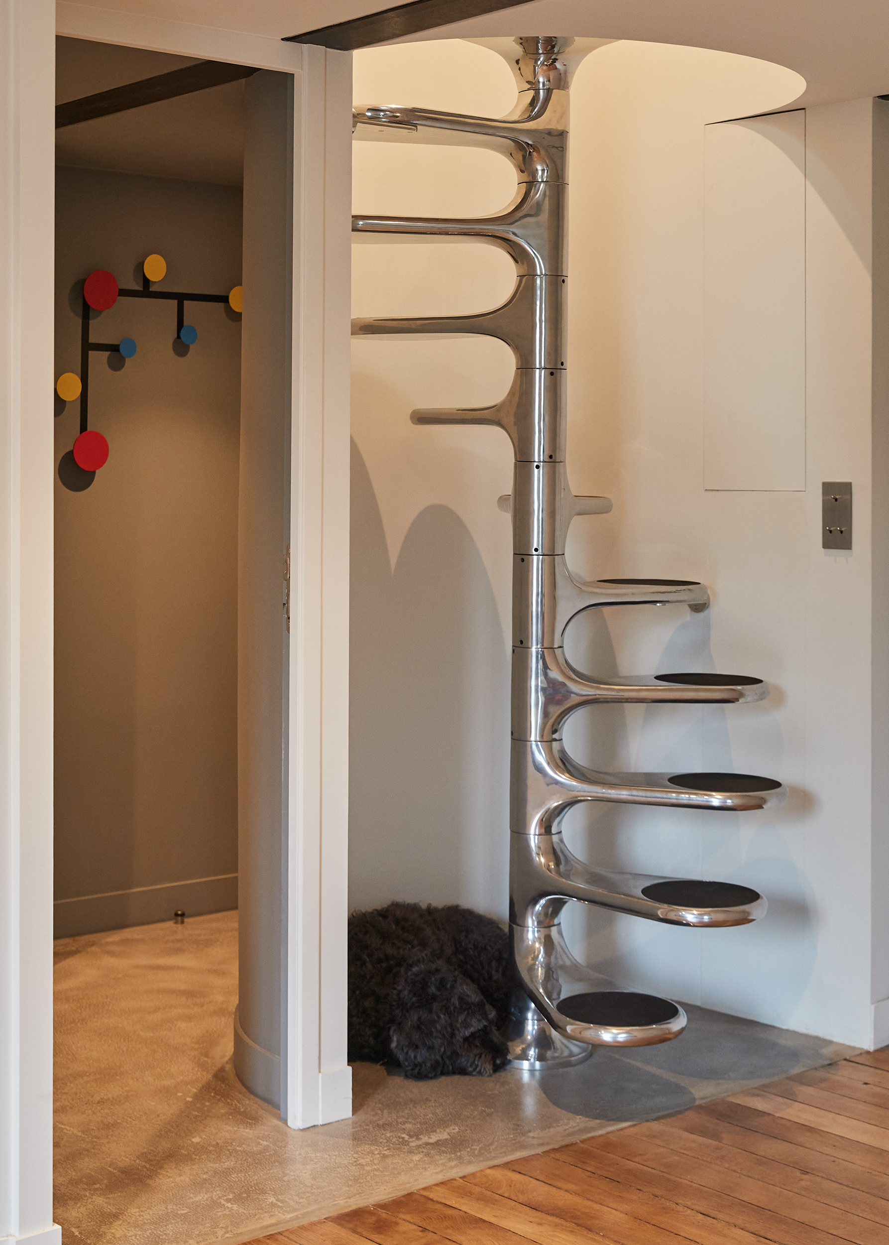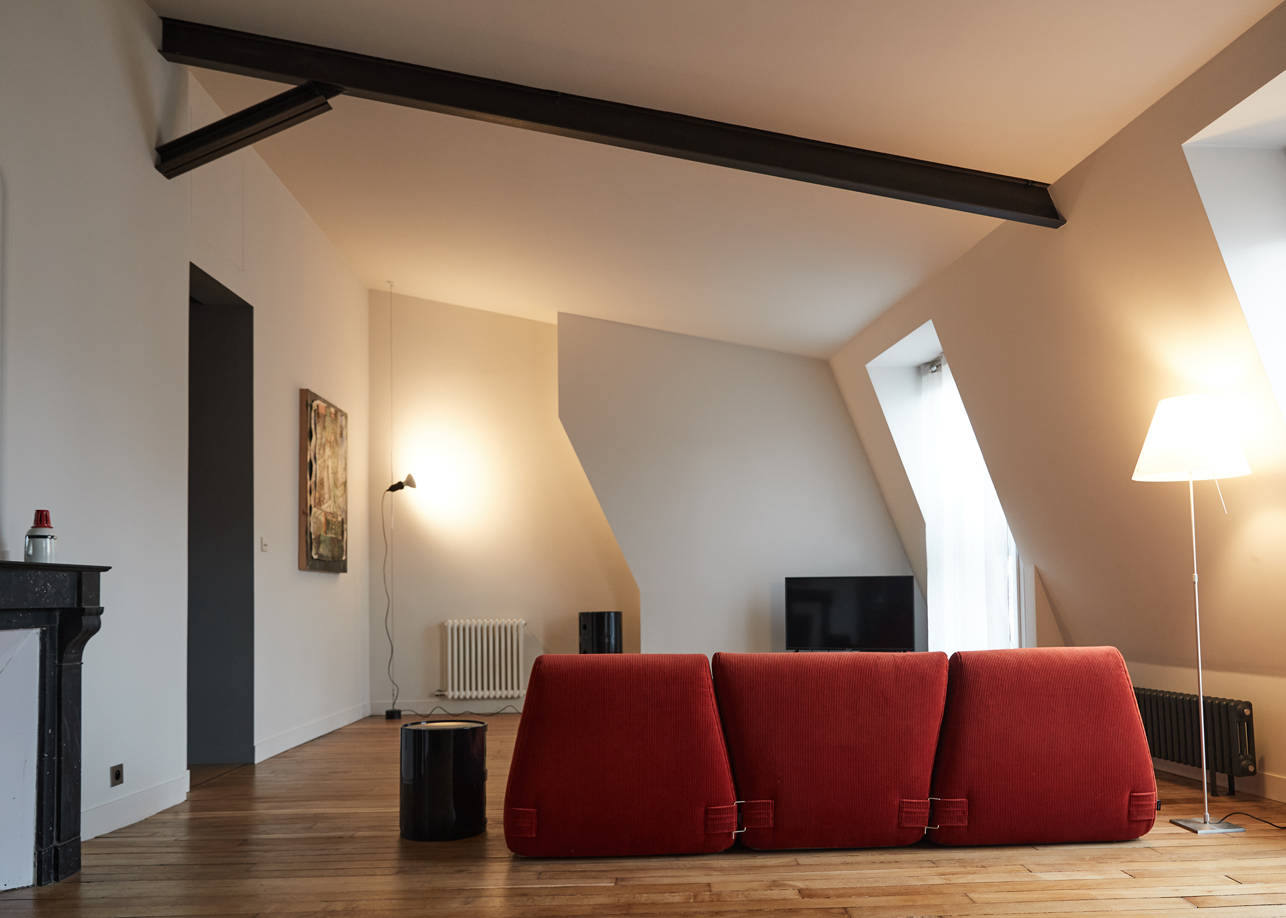 Amateur de design et d’objets chinés, le client a pu acquérir les combles auprès de la copropriété pour agrandir son appartement, auparavant bas de plafond et peu généreux, déjà issu de réunion entre différentes chambres de bonnes. Nous avons partiellement restructuré les lieux pour révéler tout le potentiel des volumes et créer une mezzanine, pensée comme une boîte suspendue et vitrée, apportant légèreté et transparence. Un escalier Roger Tallon, chiné pour l’occasion, a guidé la conception des hauteurs, tandis que l’emploi de matériaux bruts et le savoir-faire du serrurier confèrent à l’ensemble un caractère à la fois industriel et raffiné.