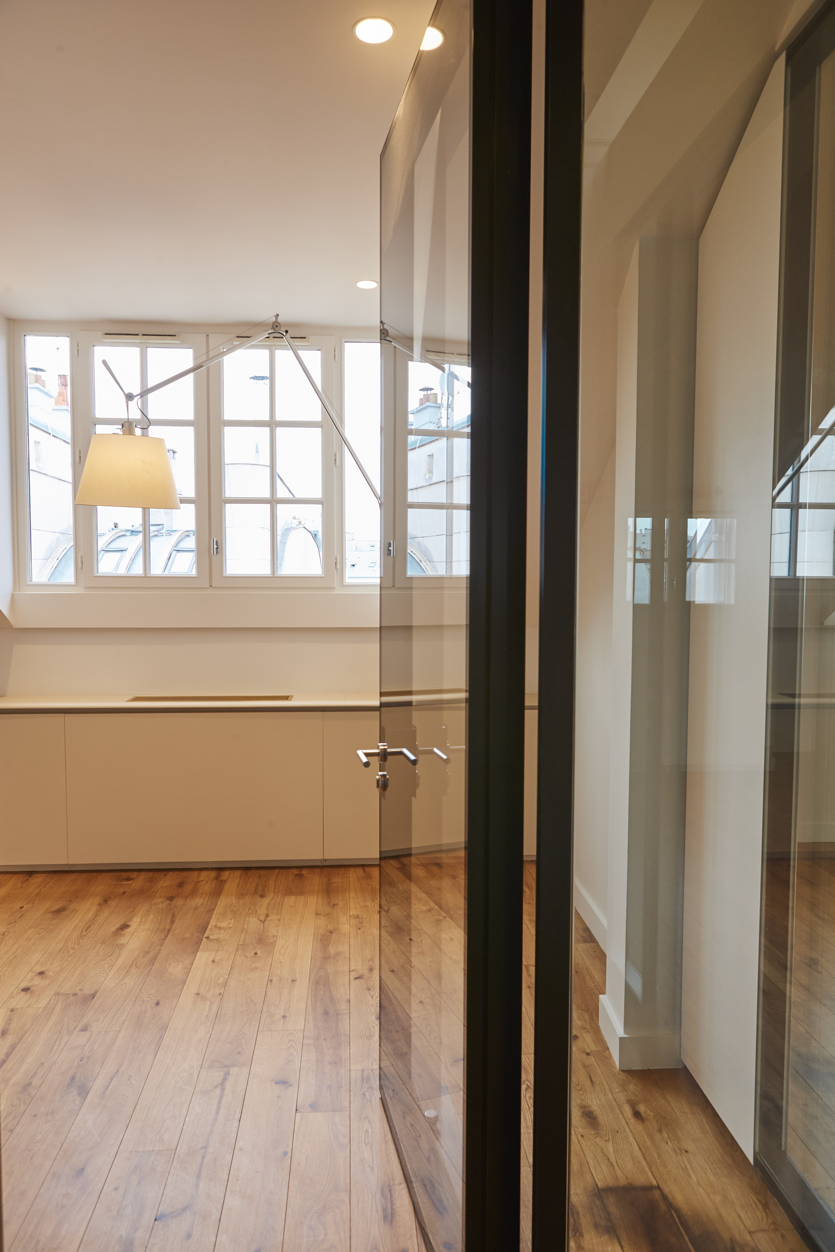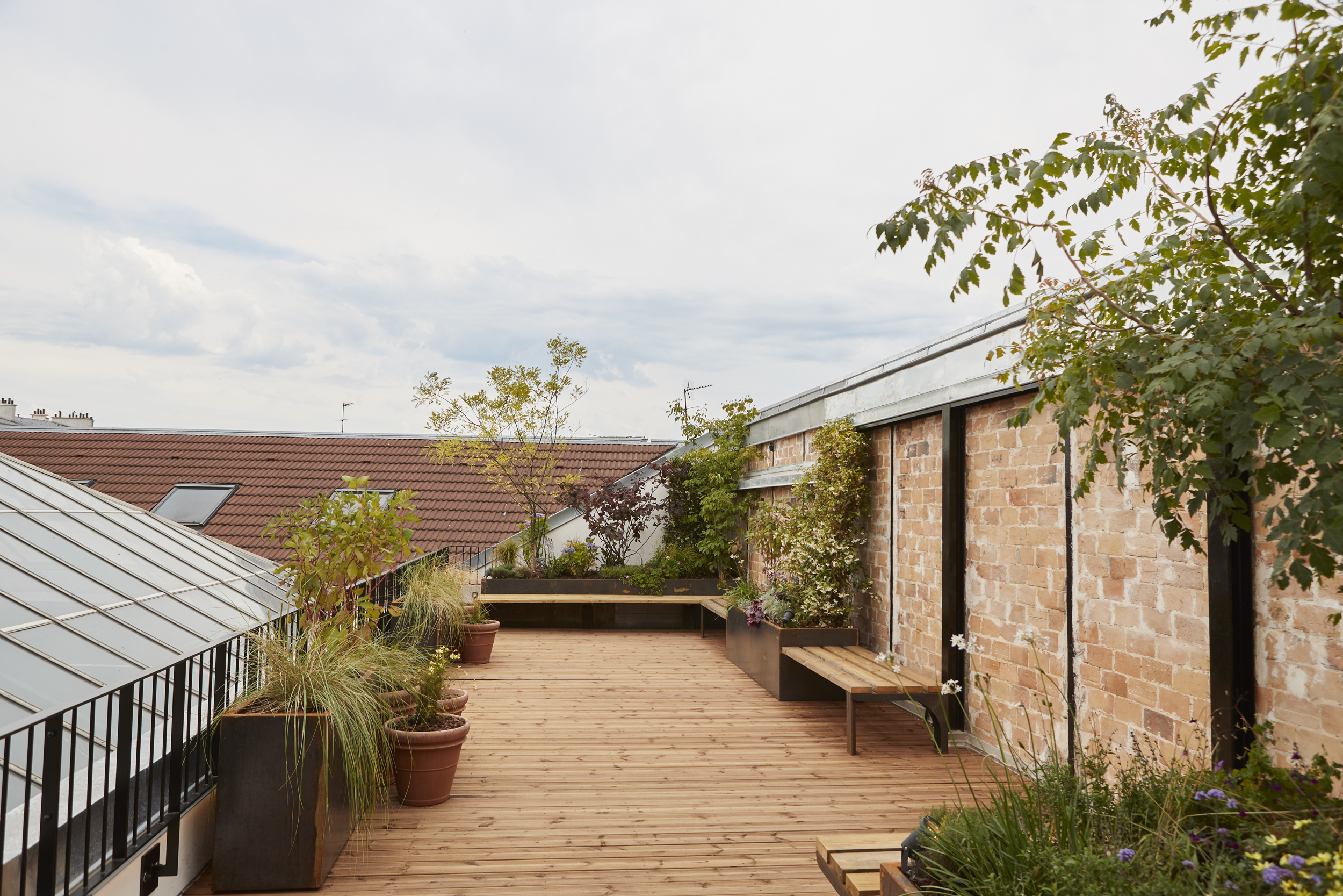 Une terrasse paysagée, créée de toute pièce à la place de la toiture, apporte un nouvel espace de respiration en plein cœur de Paris. Pensé en vue de la location, l’aménagement a été conçu pour s’adapter à une grande diversité d’usages tout en affirmant une identité singulière, offrant ainsi un lieu à la fois flexible et distinctif sur le marché.