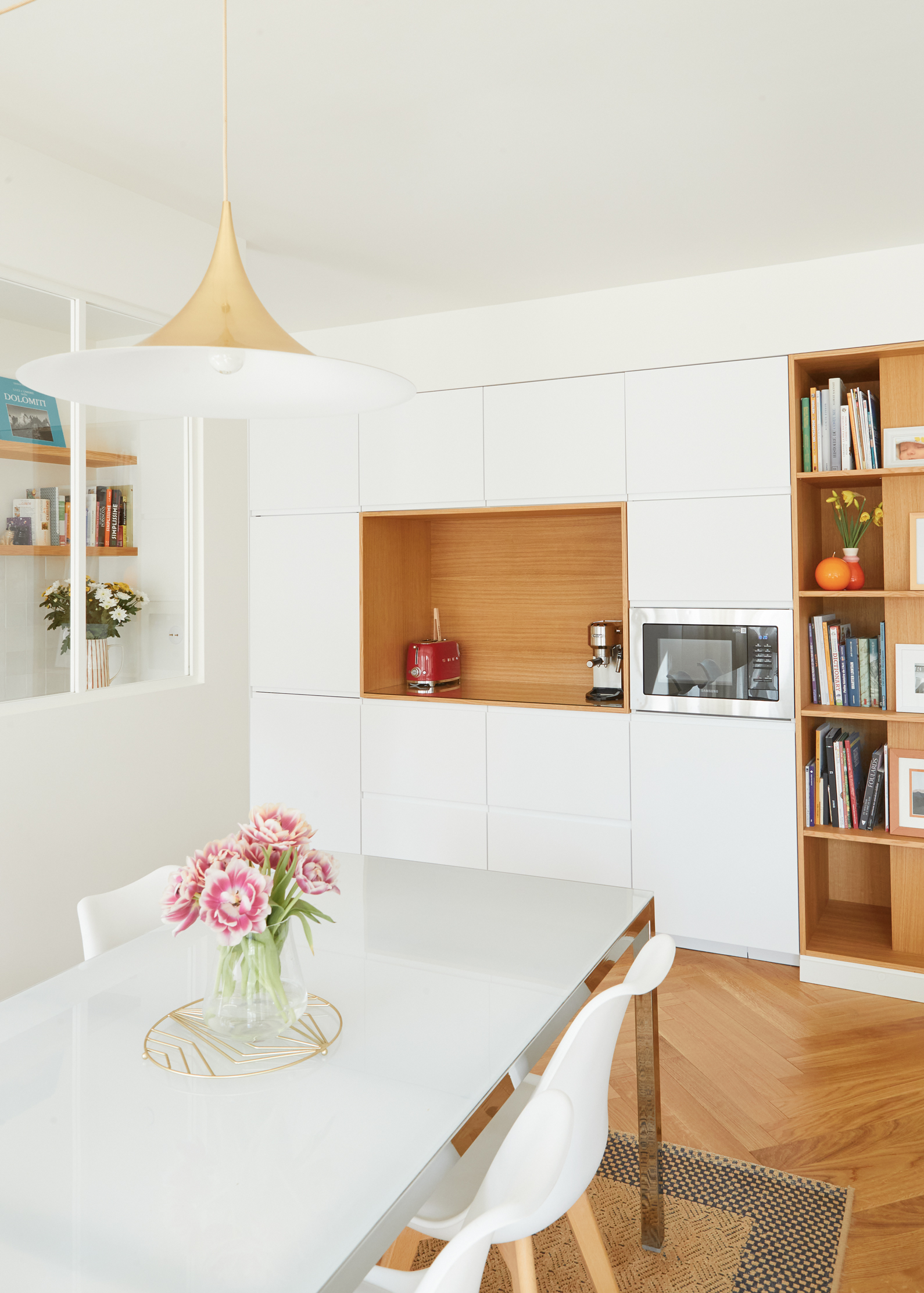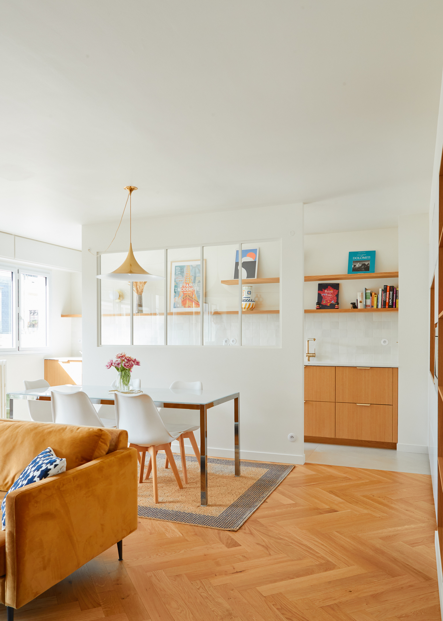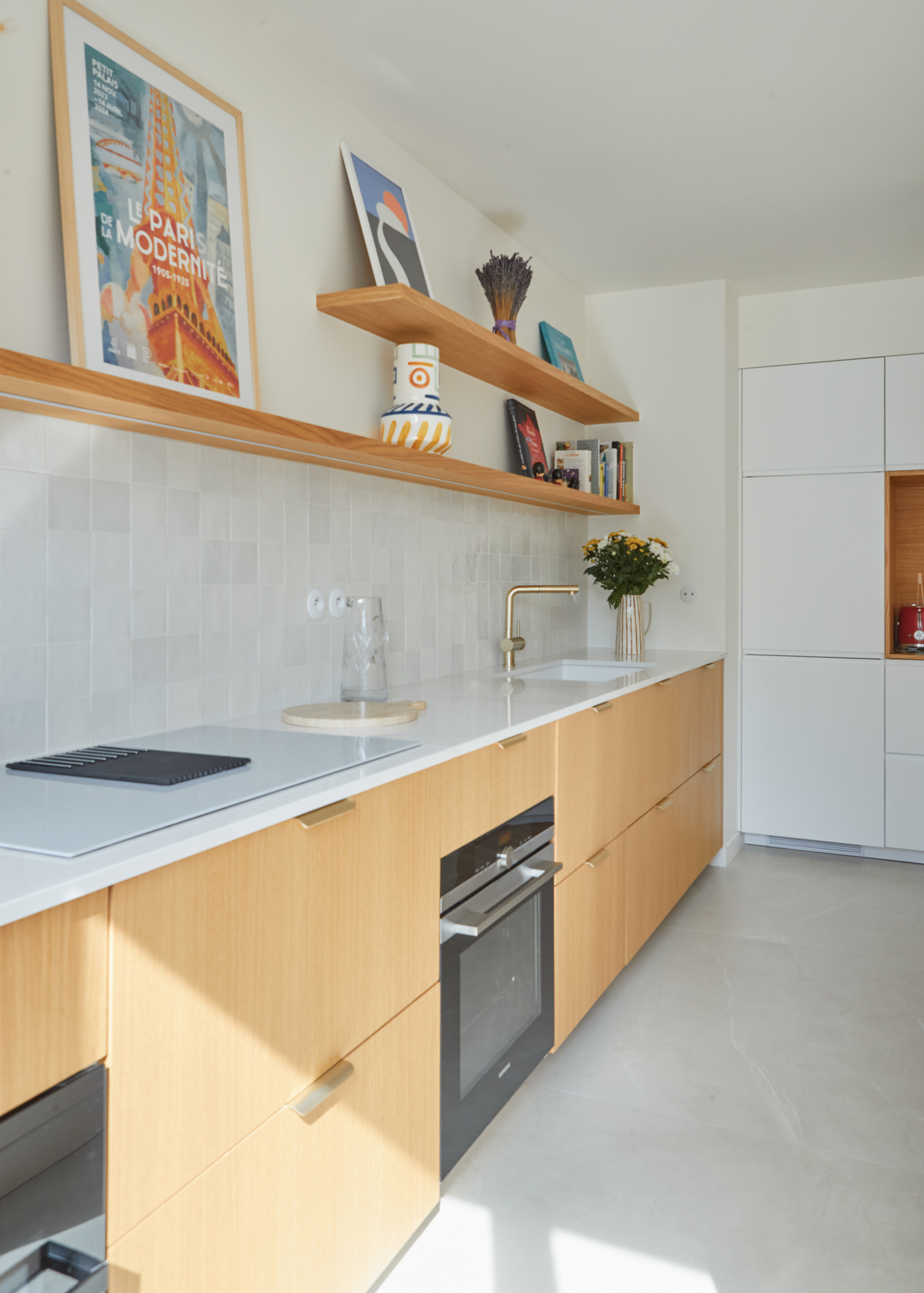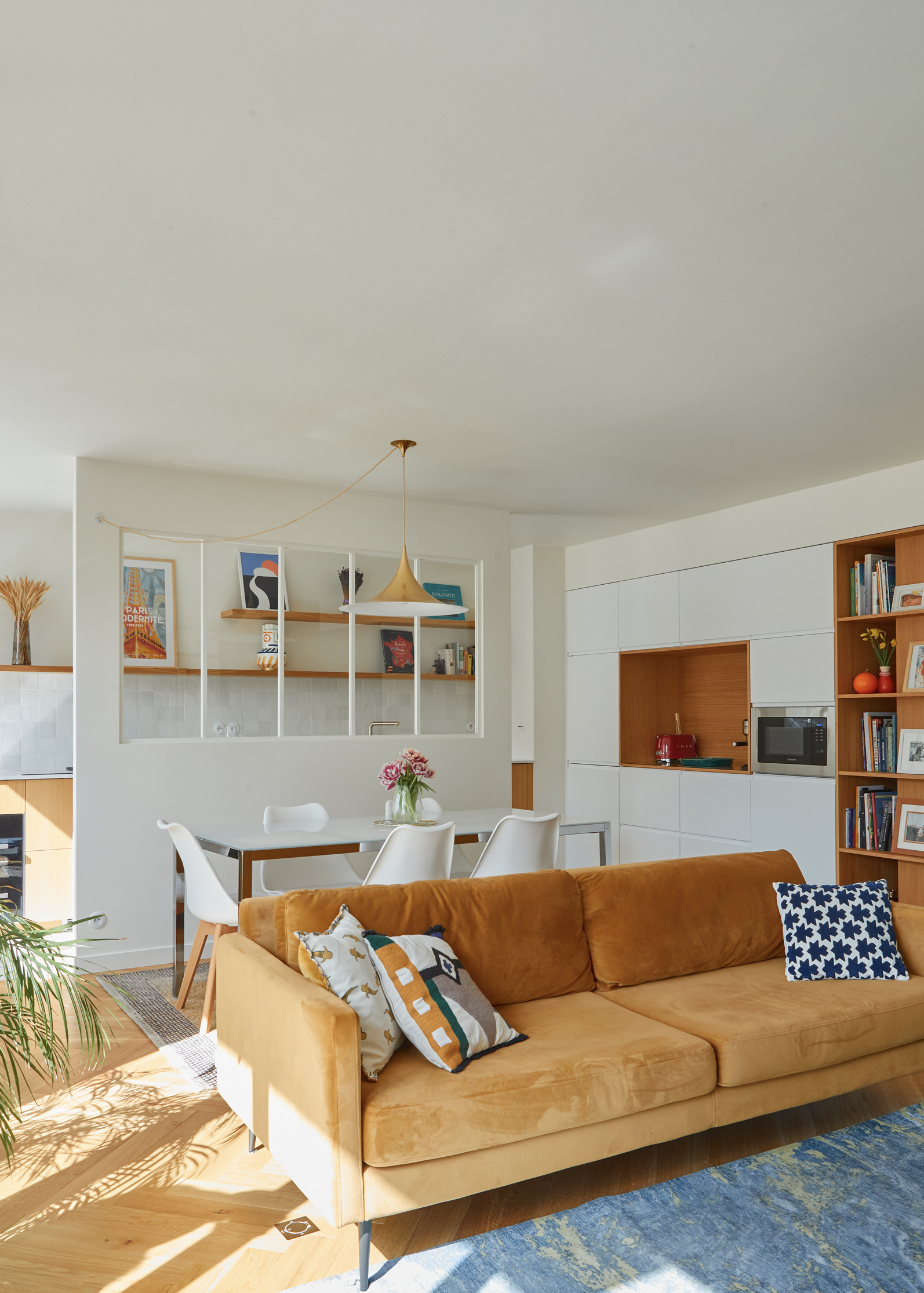 Cette rénovation complète a permis de réinventer un appartement familial autour de la lumière, véritable fil conducteur du projet. Chaque espace a été repensé pour offrir fluidité et générosité, tandis que le cloisonnement a été entièrement revu afin de créer des volumes ouverts et polyvalents. Fonctions déplacées et pièces multifonction dessinent aujourd’hui un lieu à la fois lumineux, vivant et parfaitement adapté à la vie de famille.
